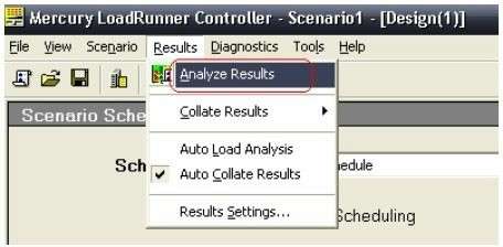 在“Mercury Load Runner Controller”窗口中,单击菜单“Results”,选择“Analyze Results”菜单项,启动“Mercury Load Runner Analyze”,对当前测试结果进行分析。